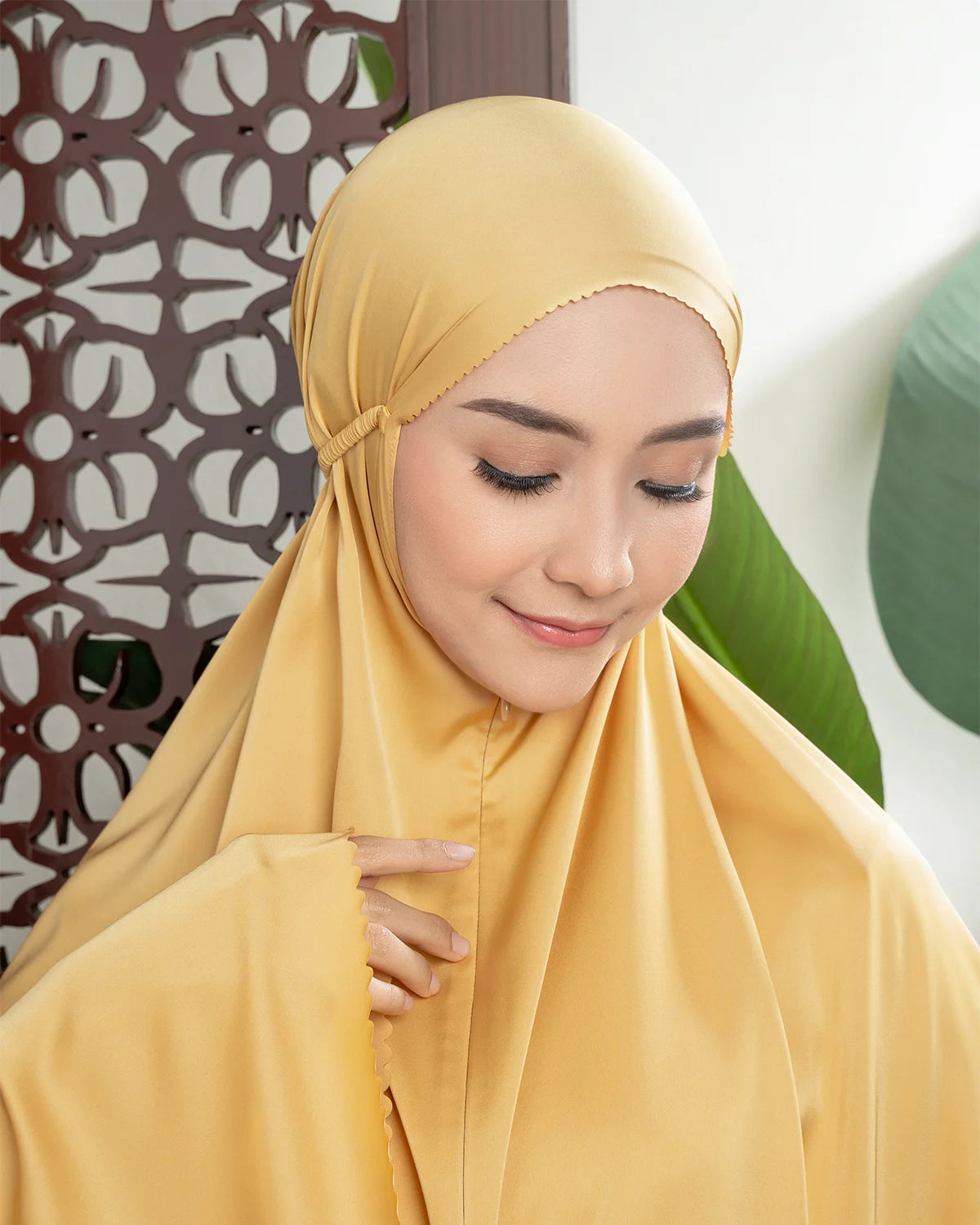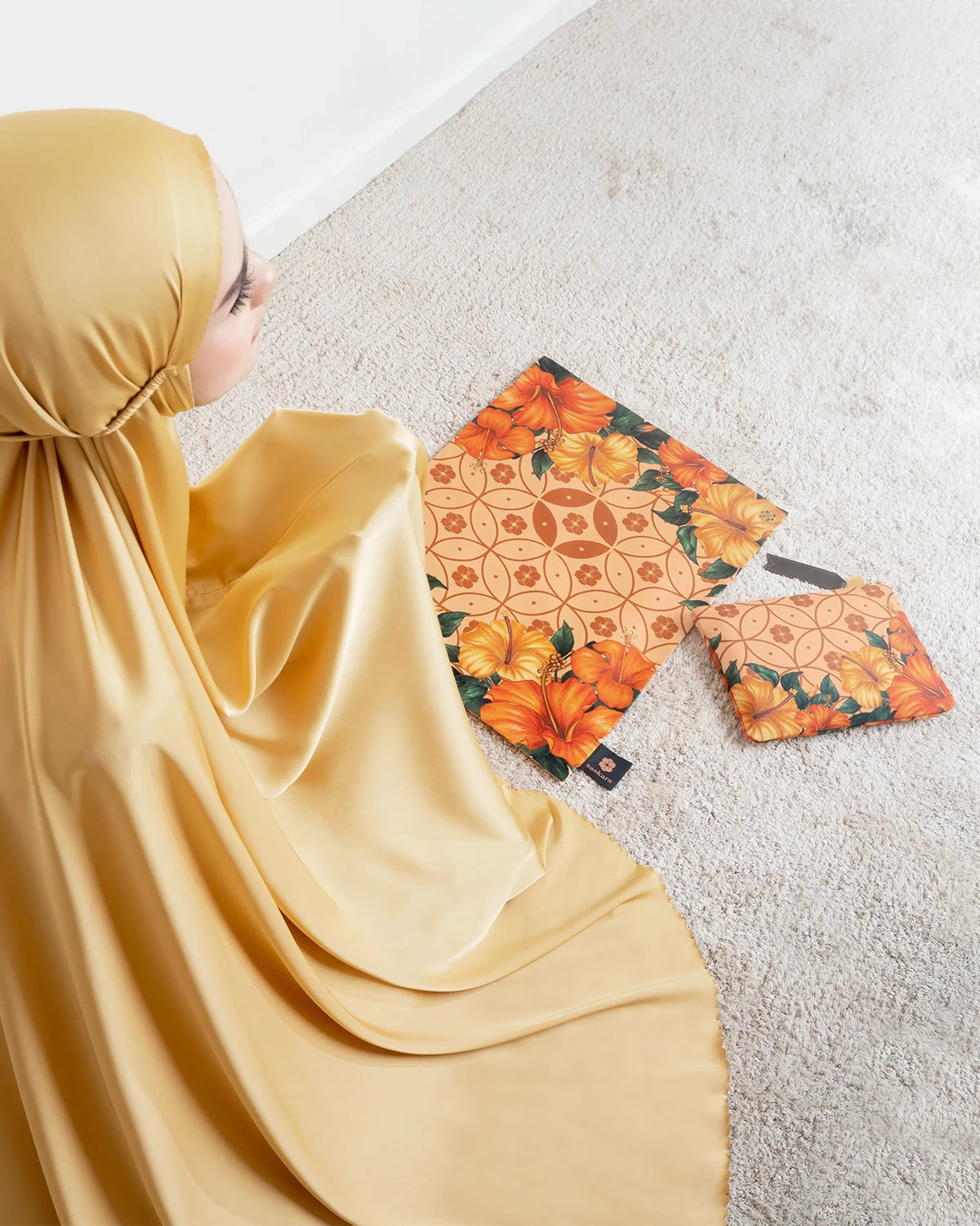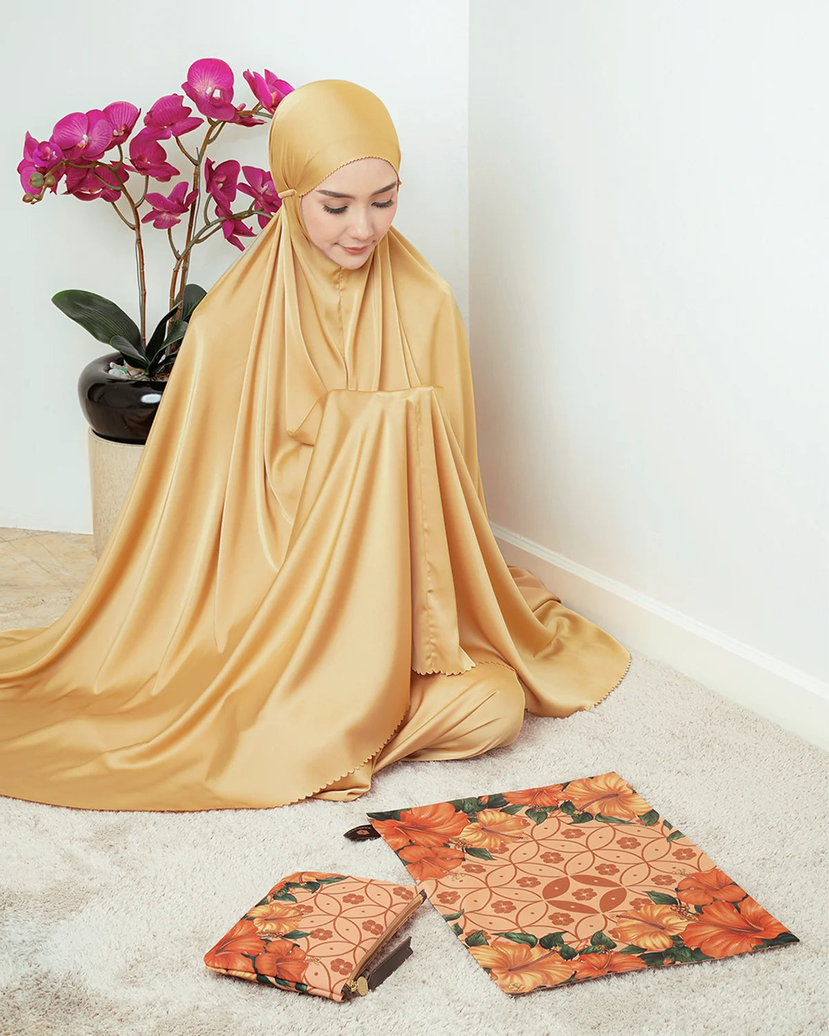 A Classic prayer robe made from soft and lux satin silk, to keep you comfortable and feels smooth as silk smoothness. Came with a sweet mini pouch and a small-size prayer mat crafted from gentle and lightweight satin, will keep your daily essentials organized.
