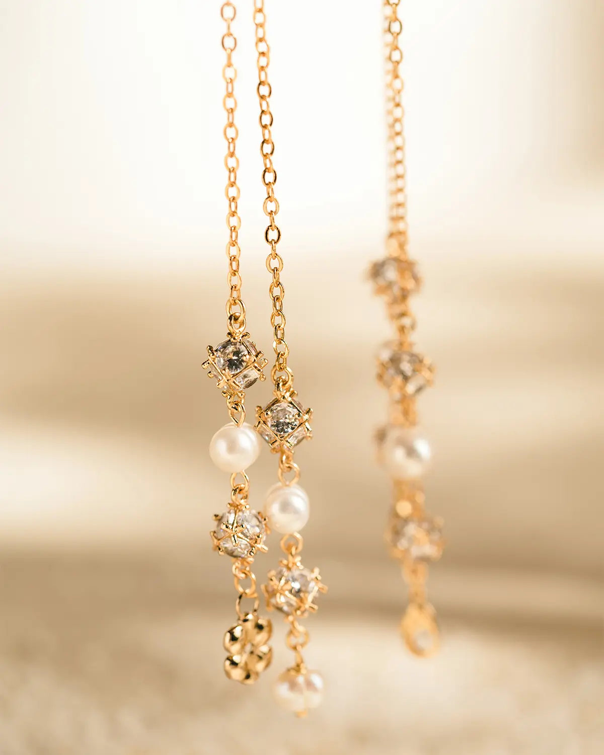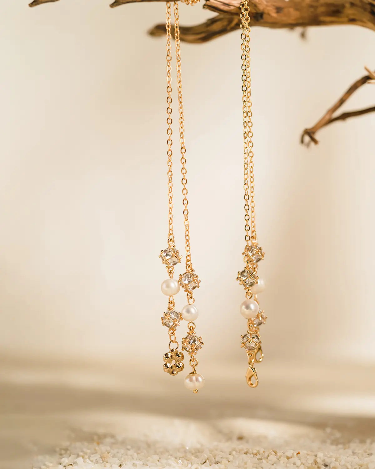 Mesmerizing, stunning, astounding, words to describe ANDHIRA, harmonized with it means, strong and brave. Pair of white zircon stone separate with white fresh water pearls, give the bold impression of what the beauty is. Strongly tied together with gold plated chainlet, stopper, and SASKARA symbol, ANDHIRA presence will attract every eyes to the holder, leaves the deep impression, and rises questions in the heartstring. This beautiful design could also be used as necklace in your everyday routines.