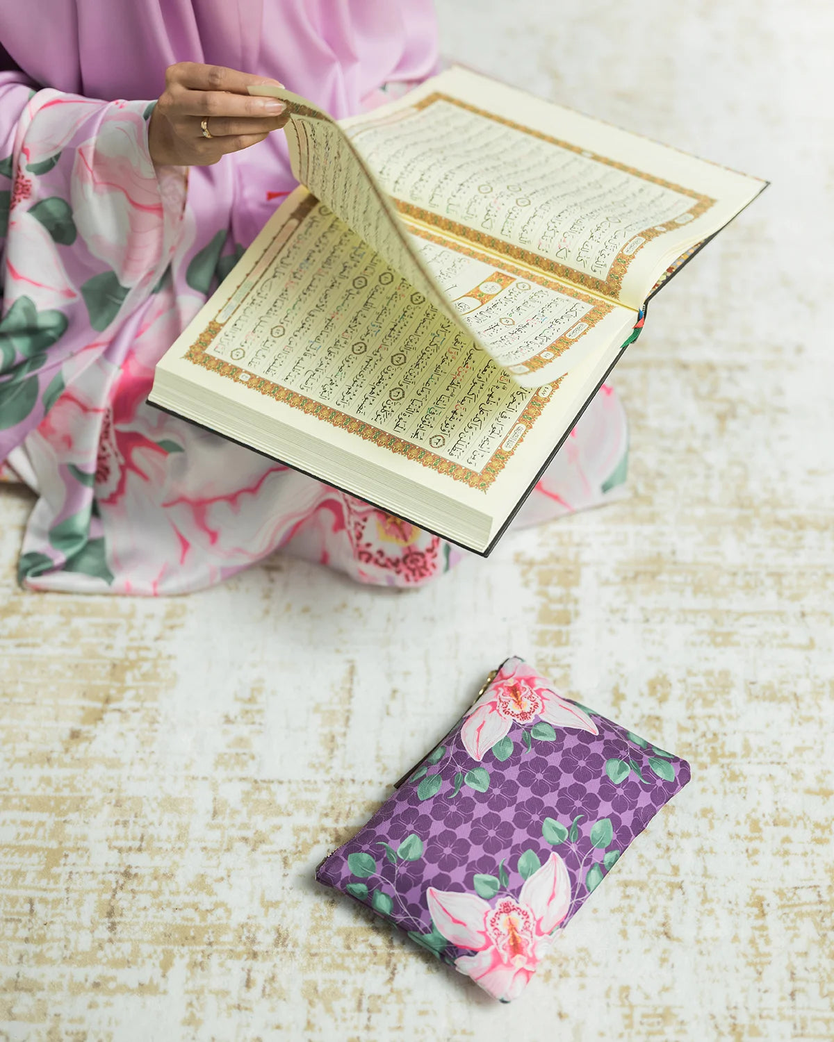 A classic prayer robe made from soft and light satin silk, to keep you comfortable, and it feels as smooth as silk. Decorated with a beautiful floral print and a lovely pouch will keep your daily essentials organized.