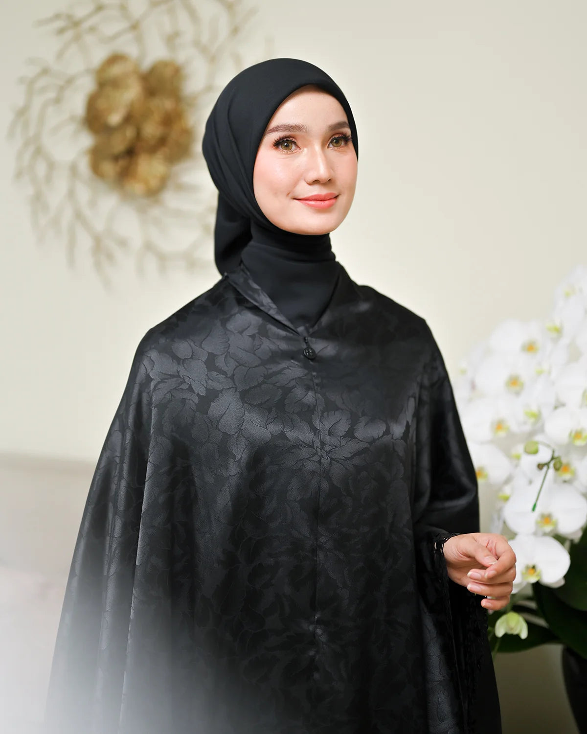 A special prayer robe in jacquard satin silk with a beautiful leaf motif and a touch of glamour with beads in the pouch. Dual purpose with front open zipper model. An elegant addition to your prayer robe collections or for your special moments.