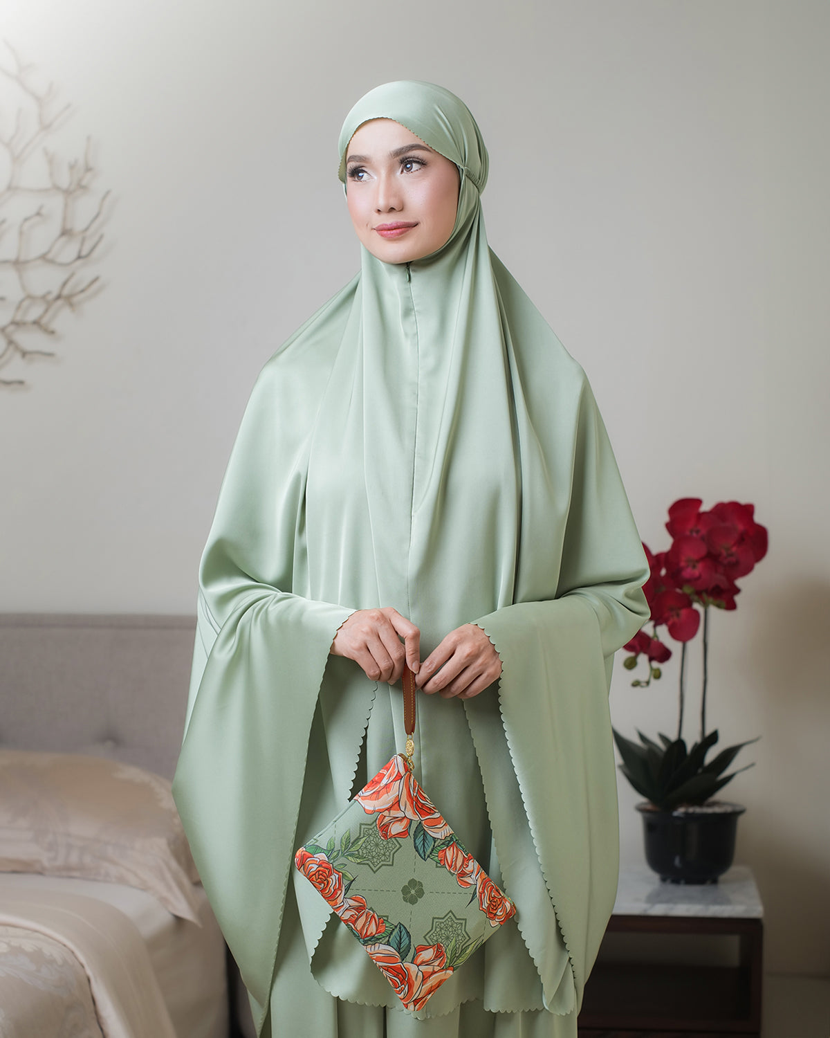 A Classic prayer robe made from soft and lux satin silk, to keep you comfortable and feels smooth as silk smoothness. Came with a sweet mini pouch and a small-size prayer mat crafted from gentle and lightweight satin, will keep your daily essentials organized.