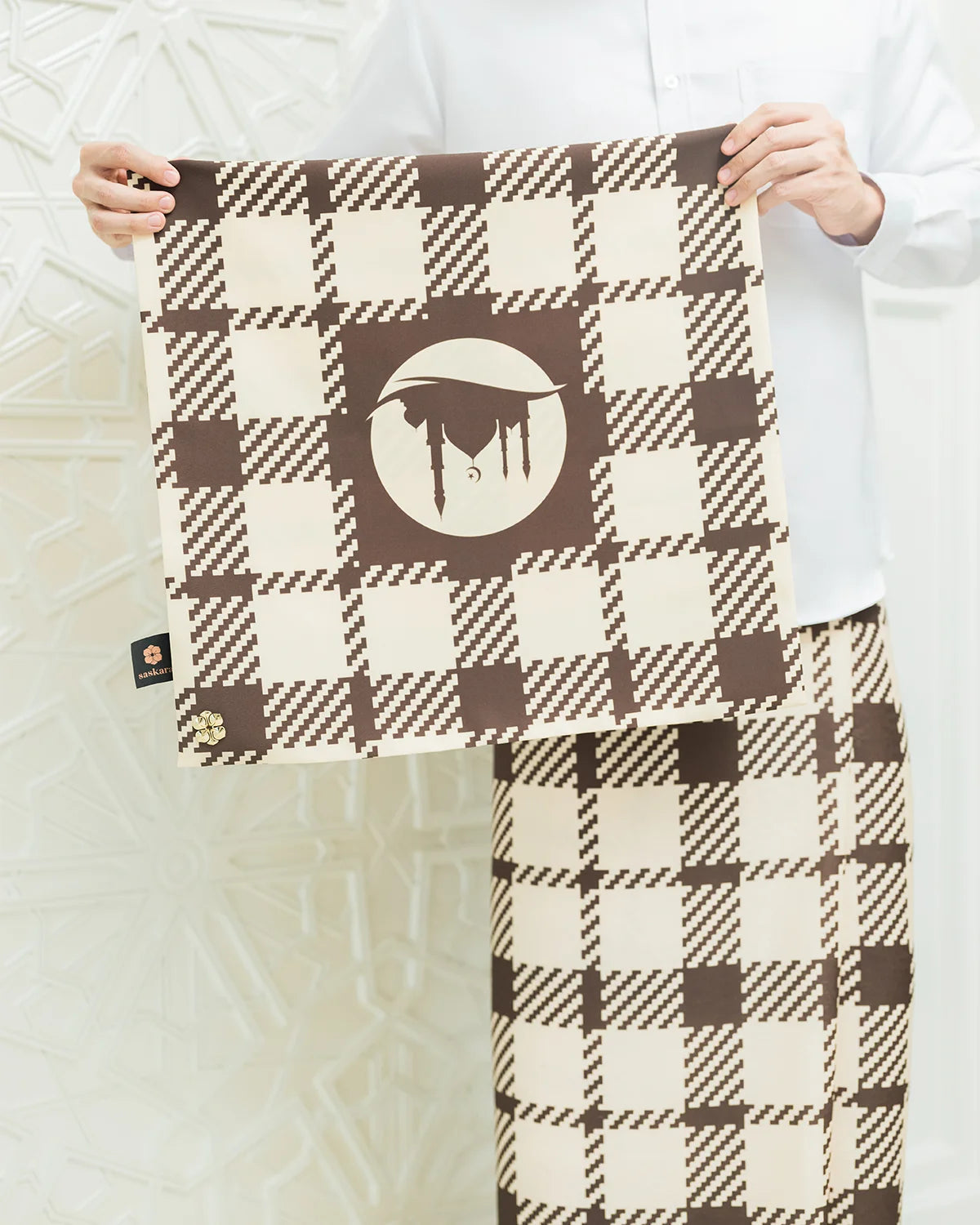 Travel prayer set for those whos active and productive. Designed carefully for him, this prayer set crafted from delicate and soft fabric, which can be folded easily in no time and hassle free. Comes with regular size prayer mat (in tone with the saroong pattern and color), it will give you a whole new prayer experience.