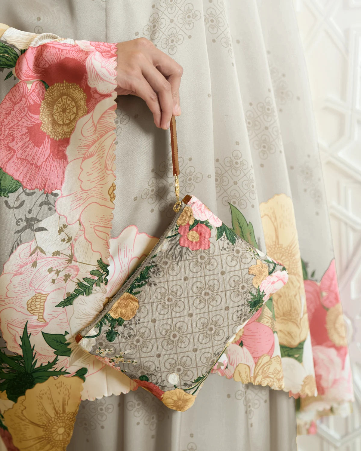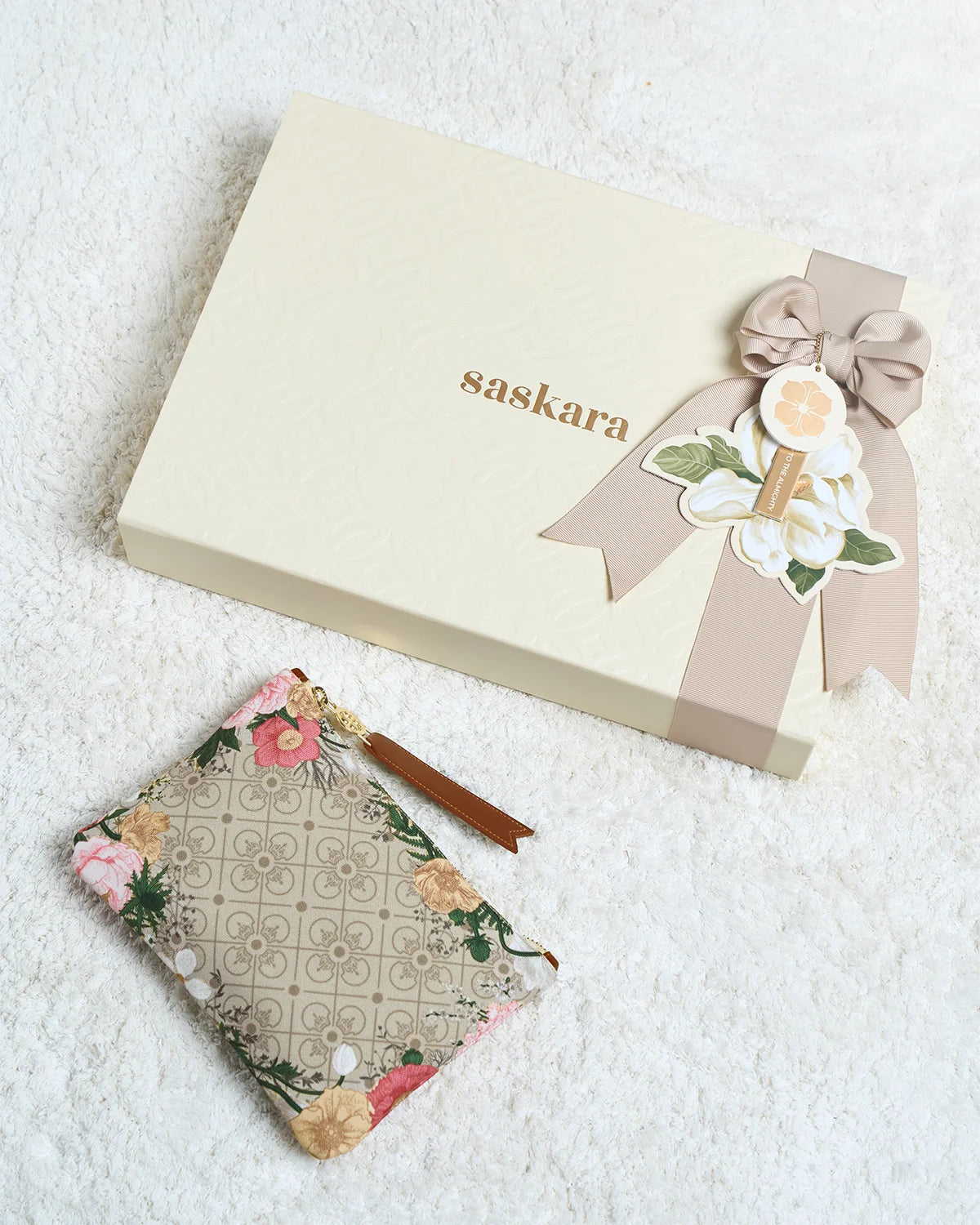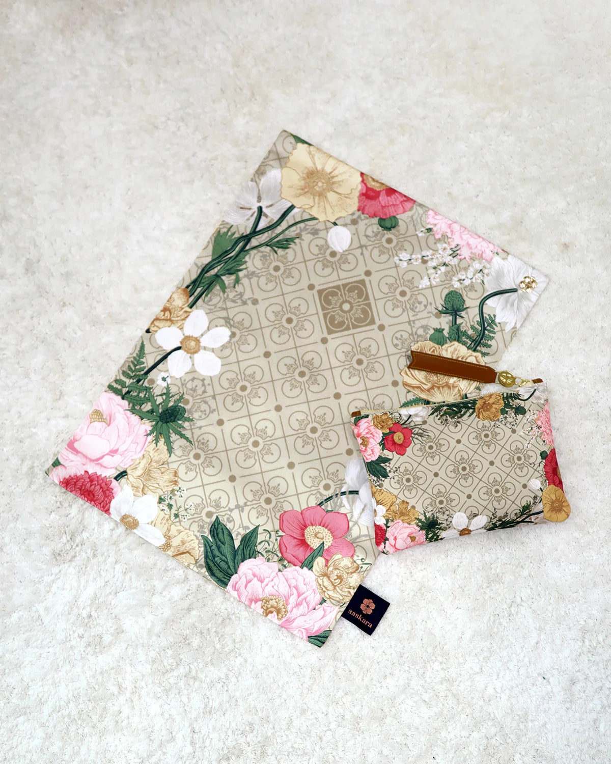 A pocket full of love. Crafted from delicate fabric for super smooth and silky touch. Indulge in little luxury with this print soft satin silk. Come with small pouch and mini size prayer mat that always fit in your bag.