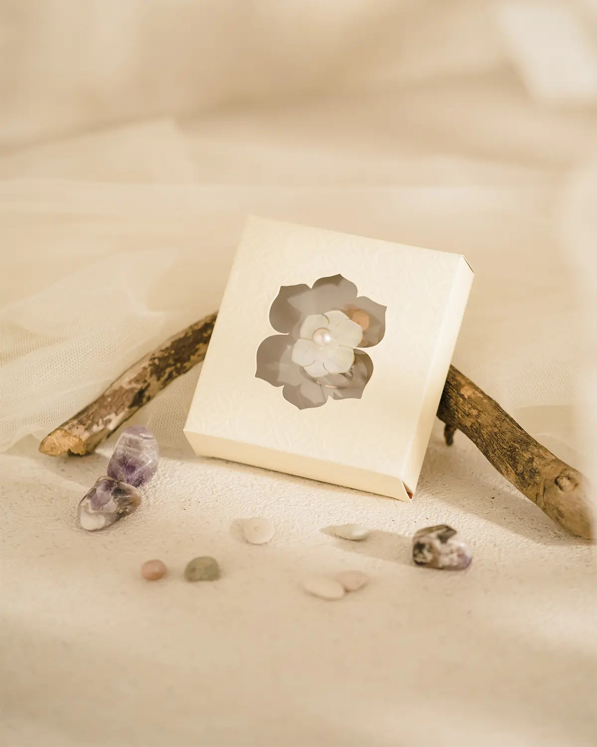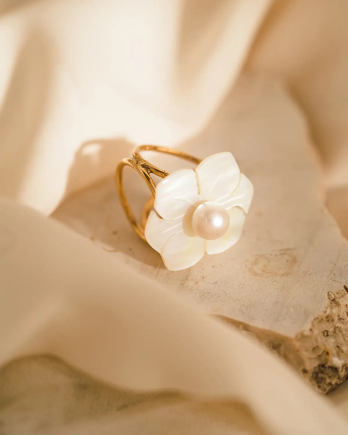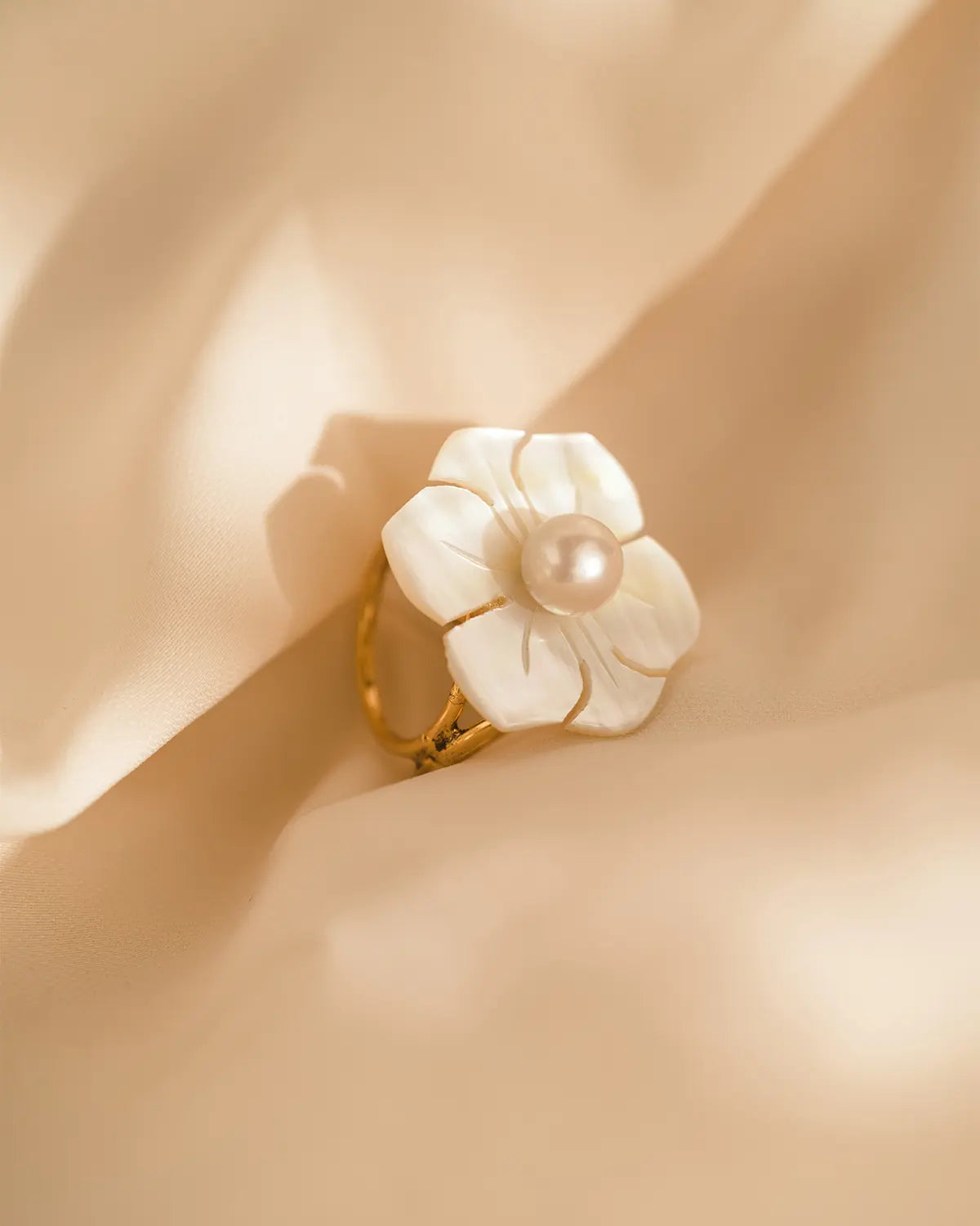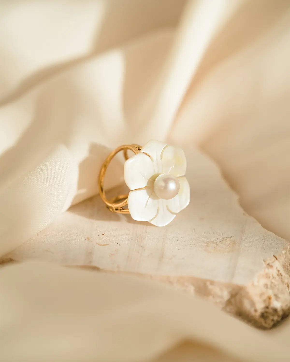 Crafted from a white color clamshell, pearl, and 3 connected gold plated ring, DAYANA represent the beauty, simple, and easiness. The pearl throne at the centre of magnolia flower shape, shaping the harmony between it's shape, color, and tone, in a form of unique scarve ring. DAYANA is a part of Kilau Mandalika series, representation of Indonesia’s heritage from Nusa Tenggara Barat Province.