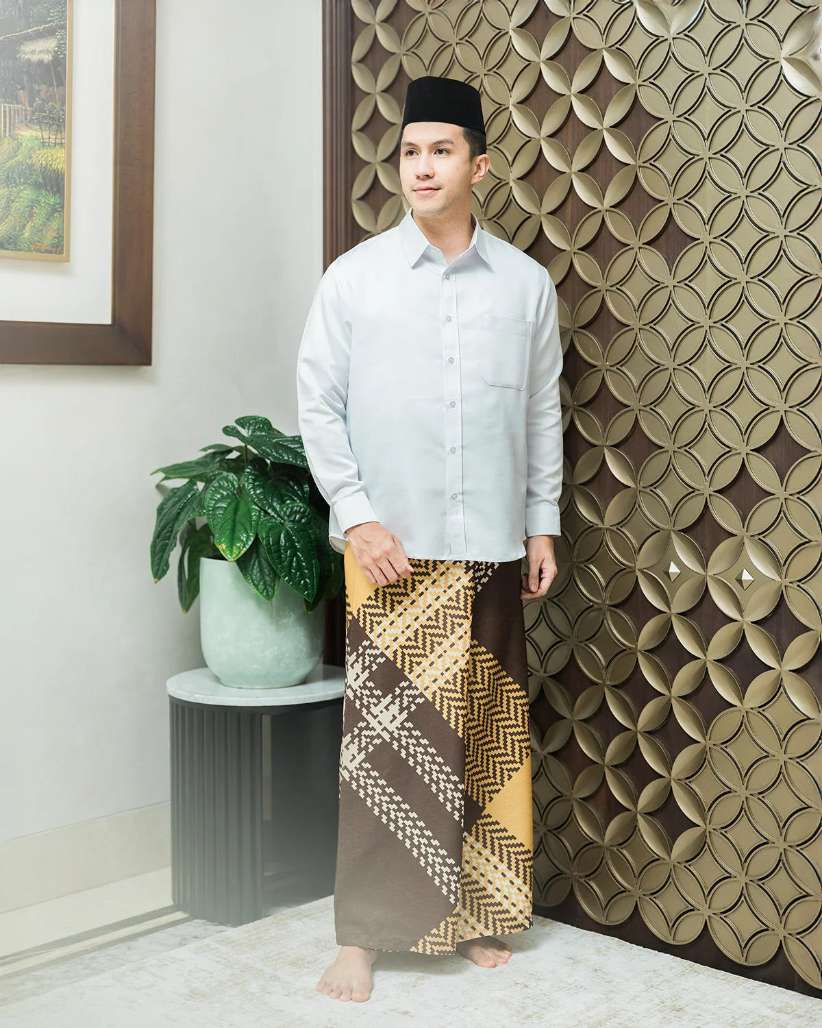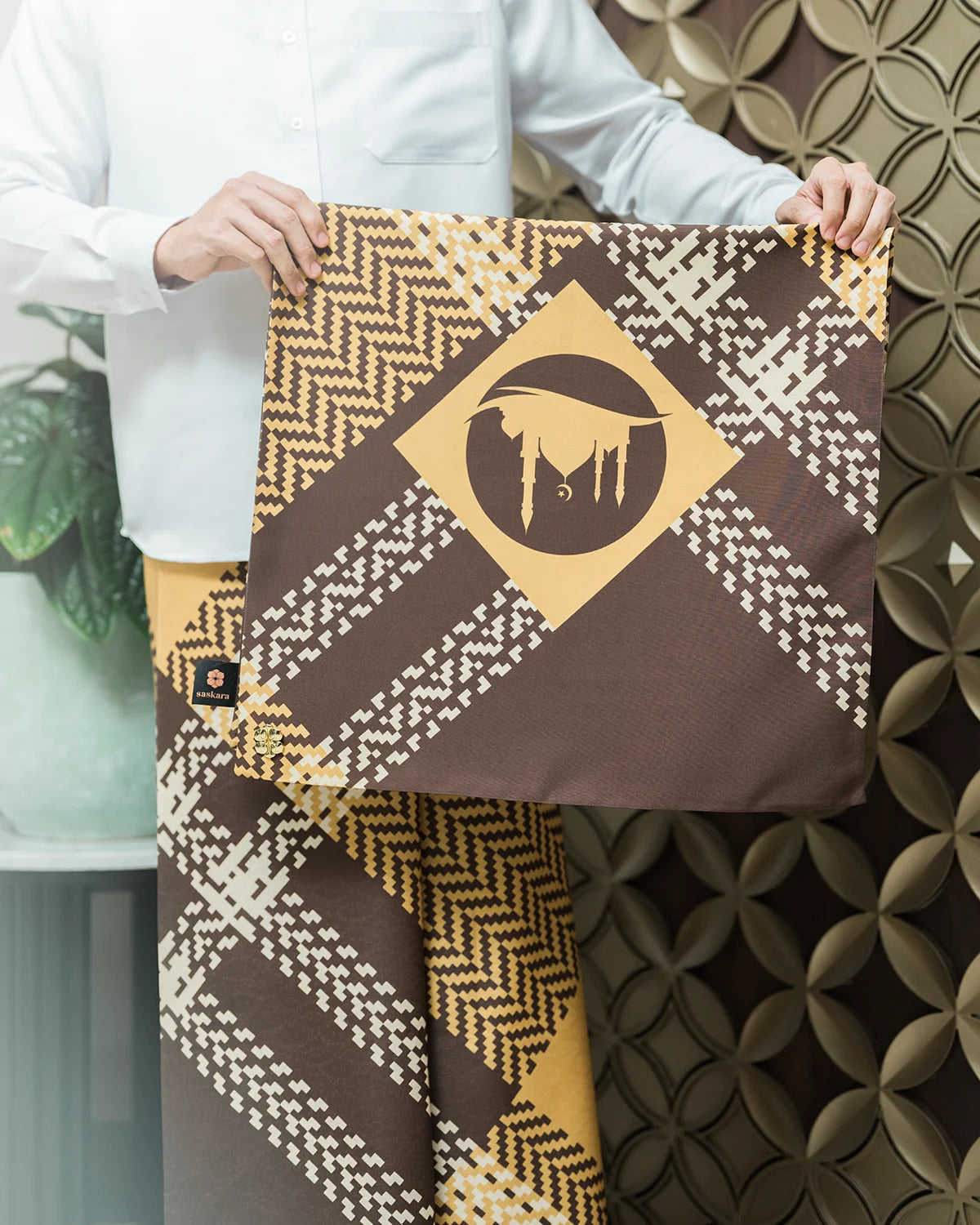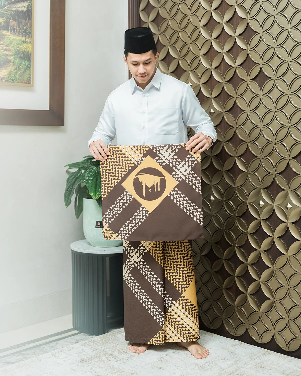 Travel prayer set for those whos active and productive. Designed carefully for him, this prayer set crafted from delicate and soft fabric, which can be folded easily in no time and hassle free. Comes with regular size prayer mat (in tone with the saroong pattern and color), it will give you a whole new prayer experience.