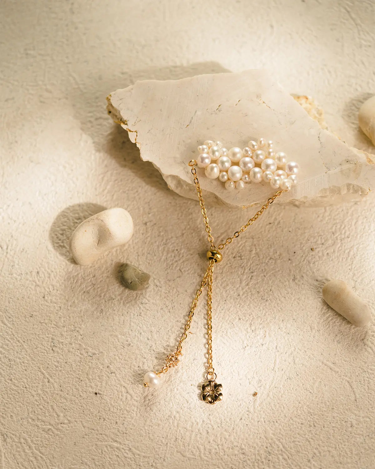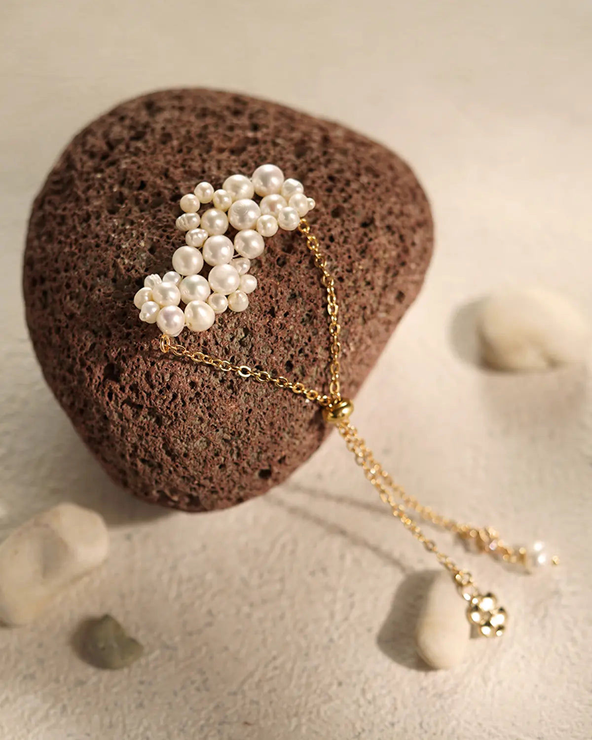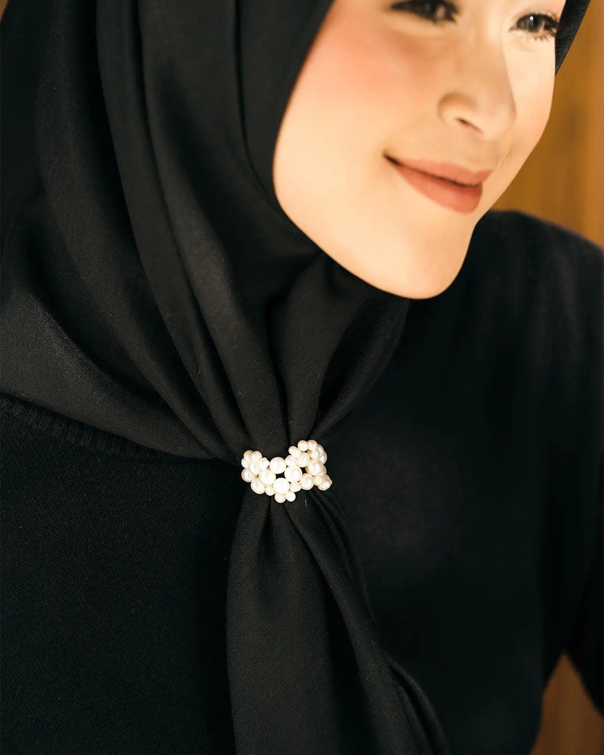 GAYATRI means 3 strength, defining its 3 main materials, which is pearls, gold, and metal. Multiple sizes of fresh water pearls, arranged closely together, tied with gold plated chain, in the form of drawstring scarve ring to accompany your daily scarves wear, in a formal or casual occasion. GAYATRI is a part of Kilau Mandalika series, representation of Indonesia’s heritage from Nusa Tenggara Barat Province.