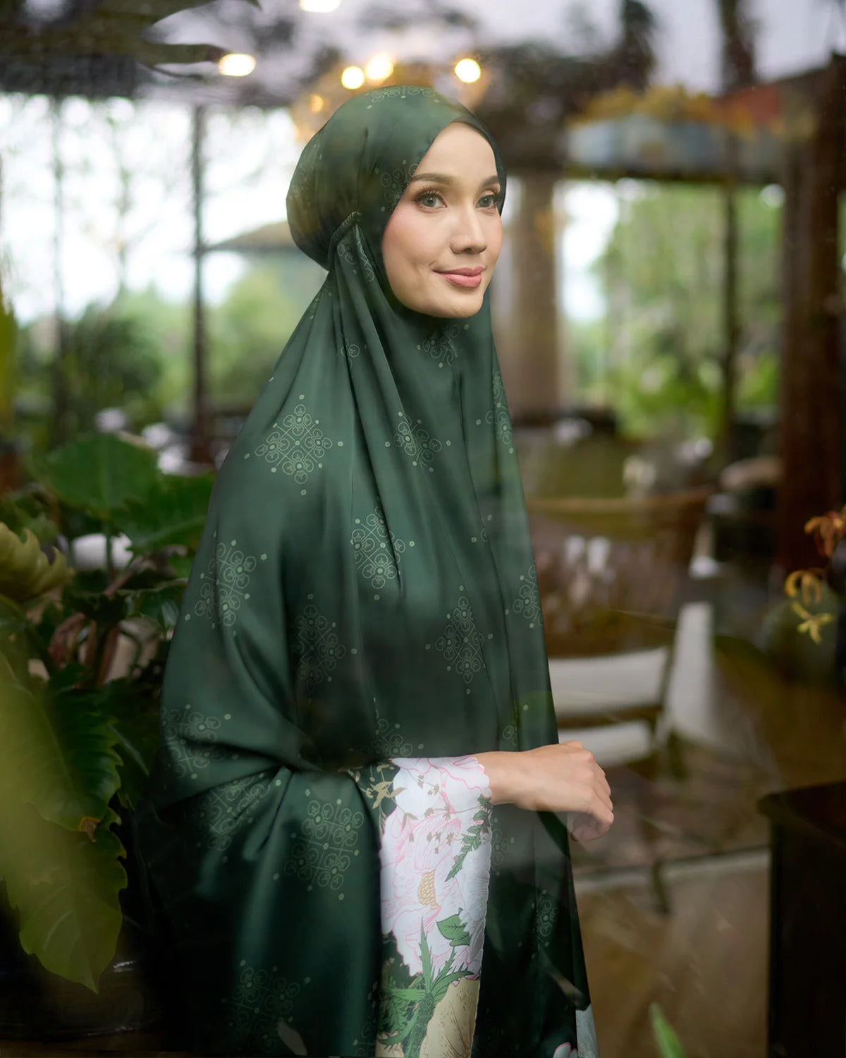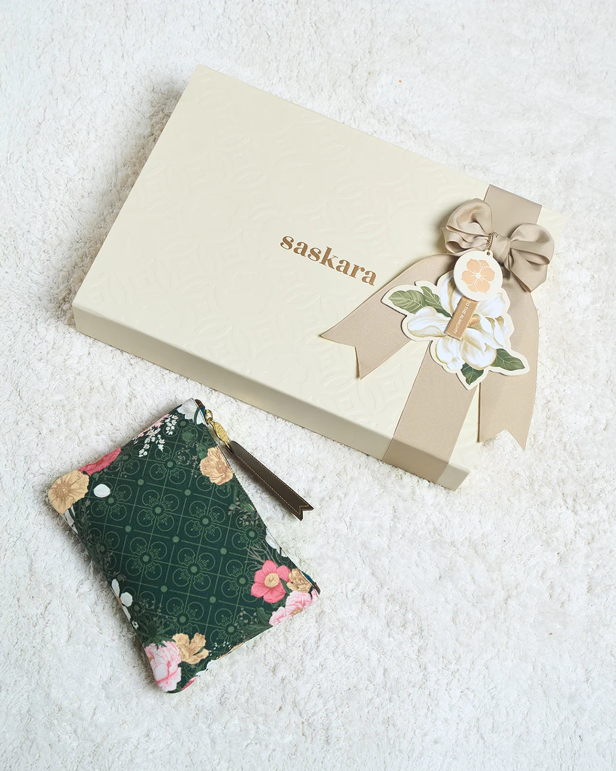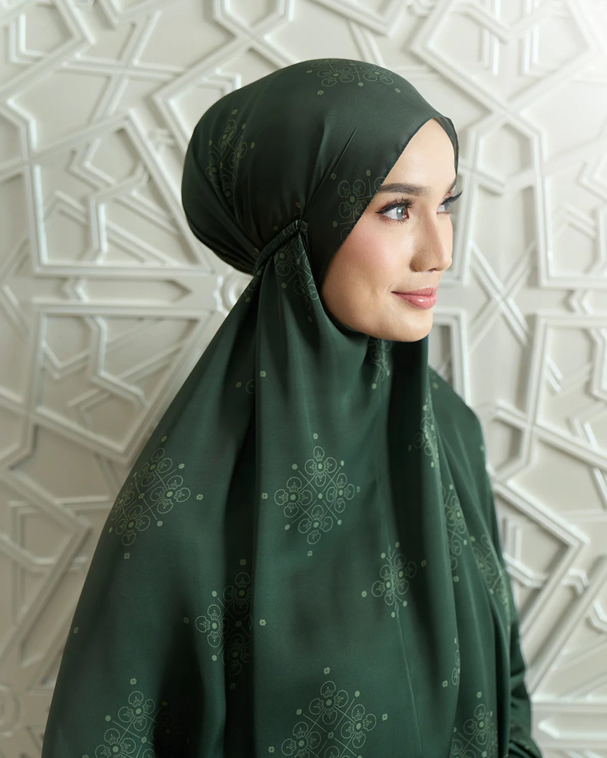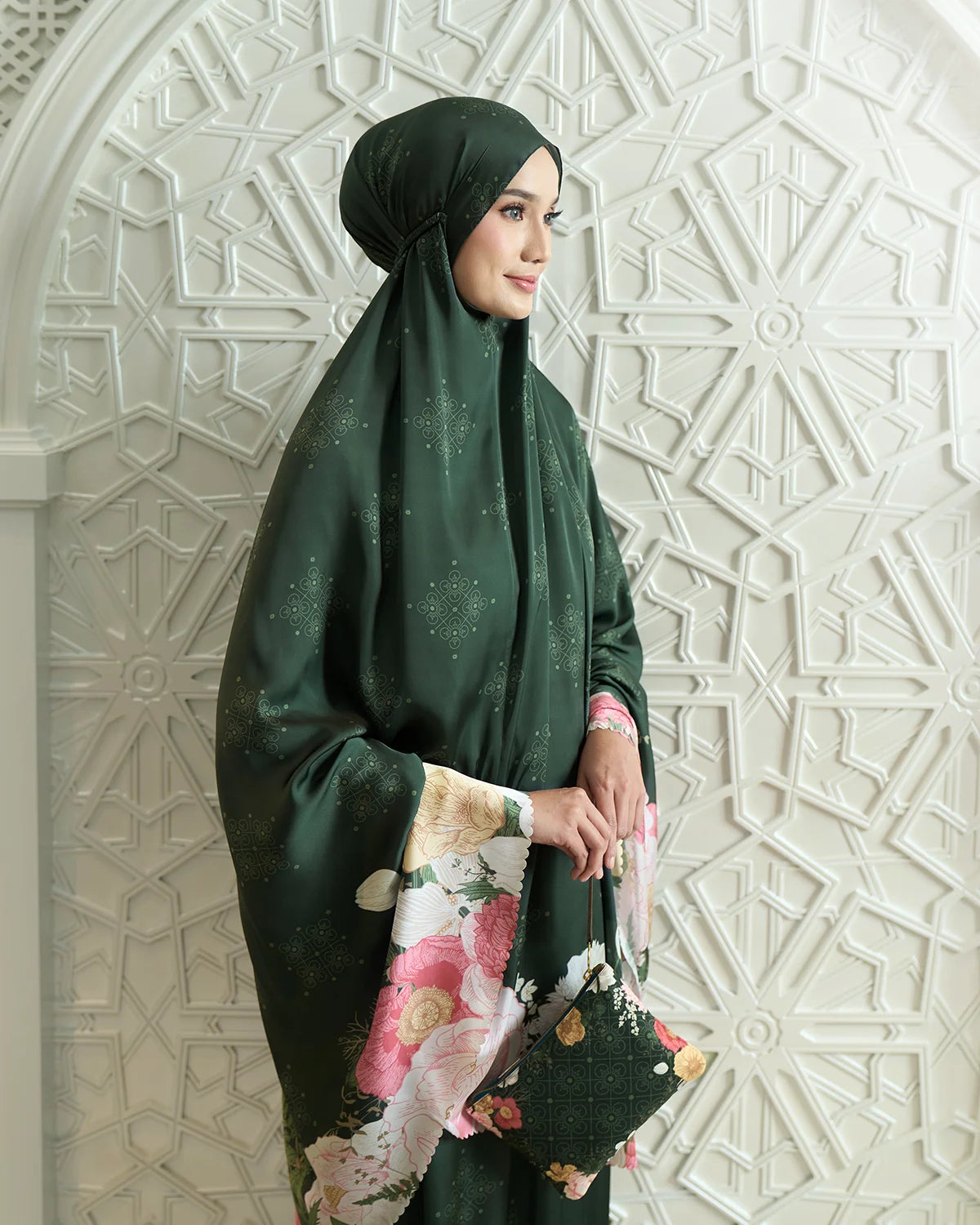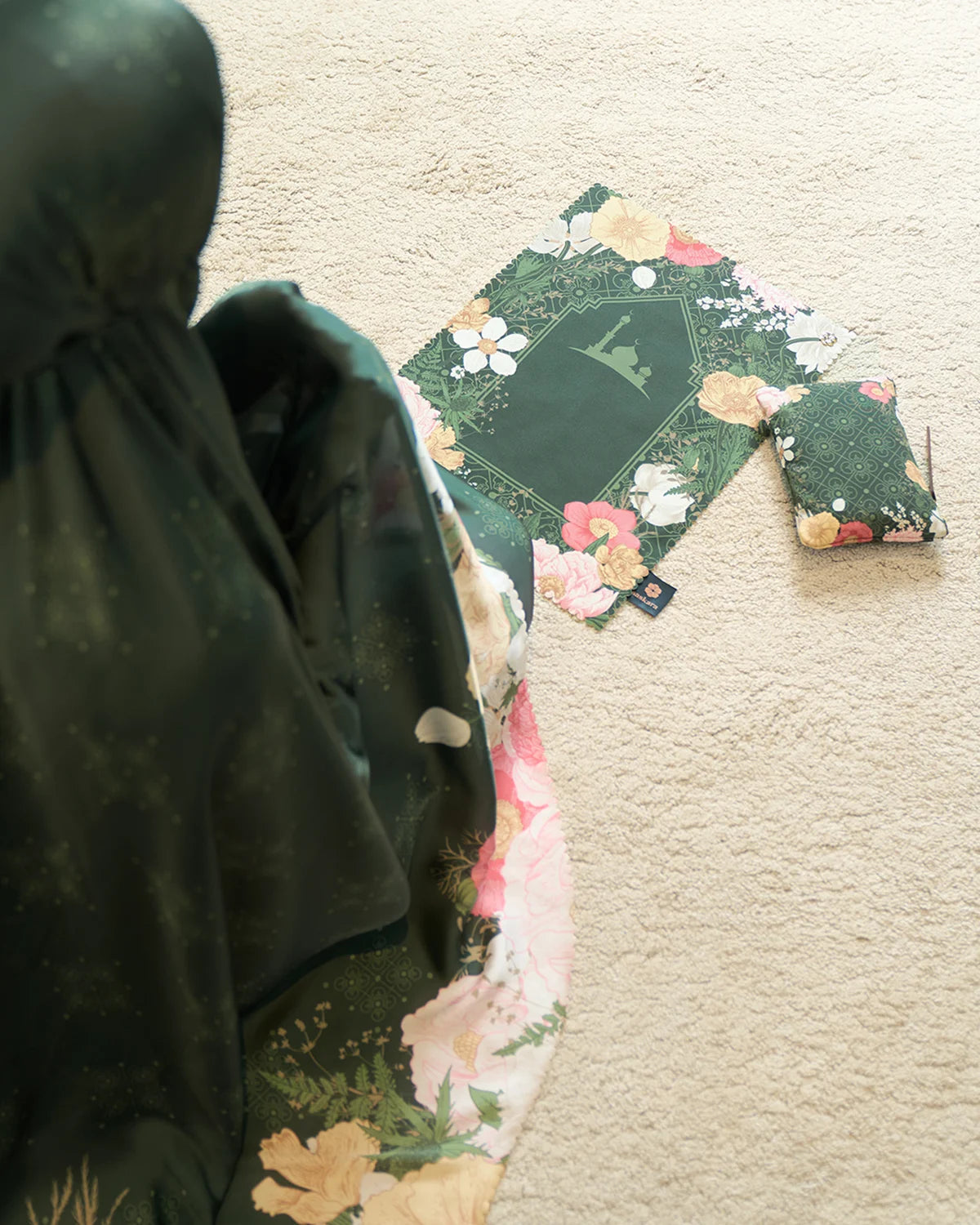 A pocket full of love. Crafted from delicate fabric for super smooth and silky touch. Indulge in little luxury with this print soft satin silk. Come with small pouch and mini size prayer mat that always fit in your bag.