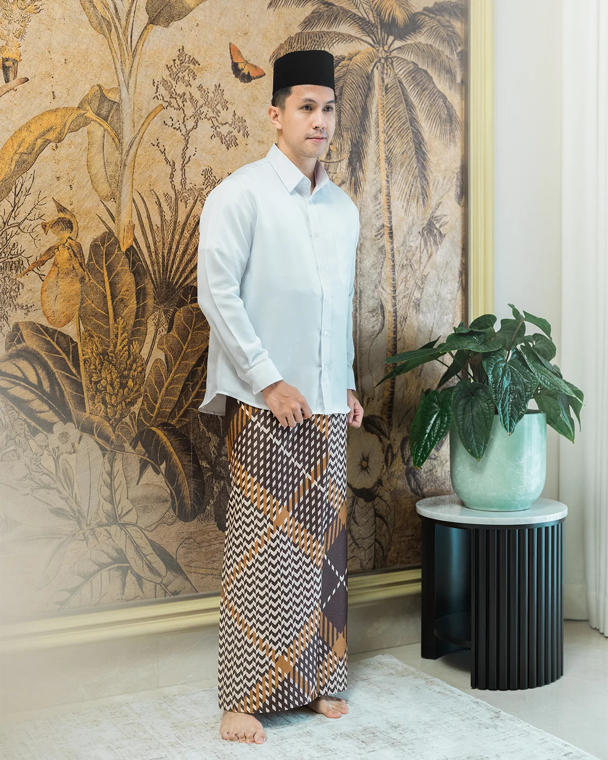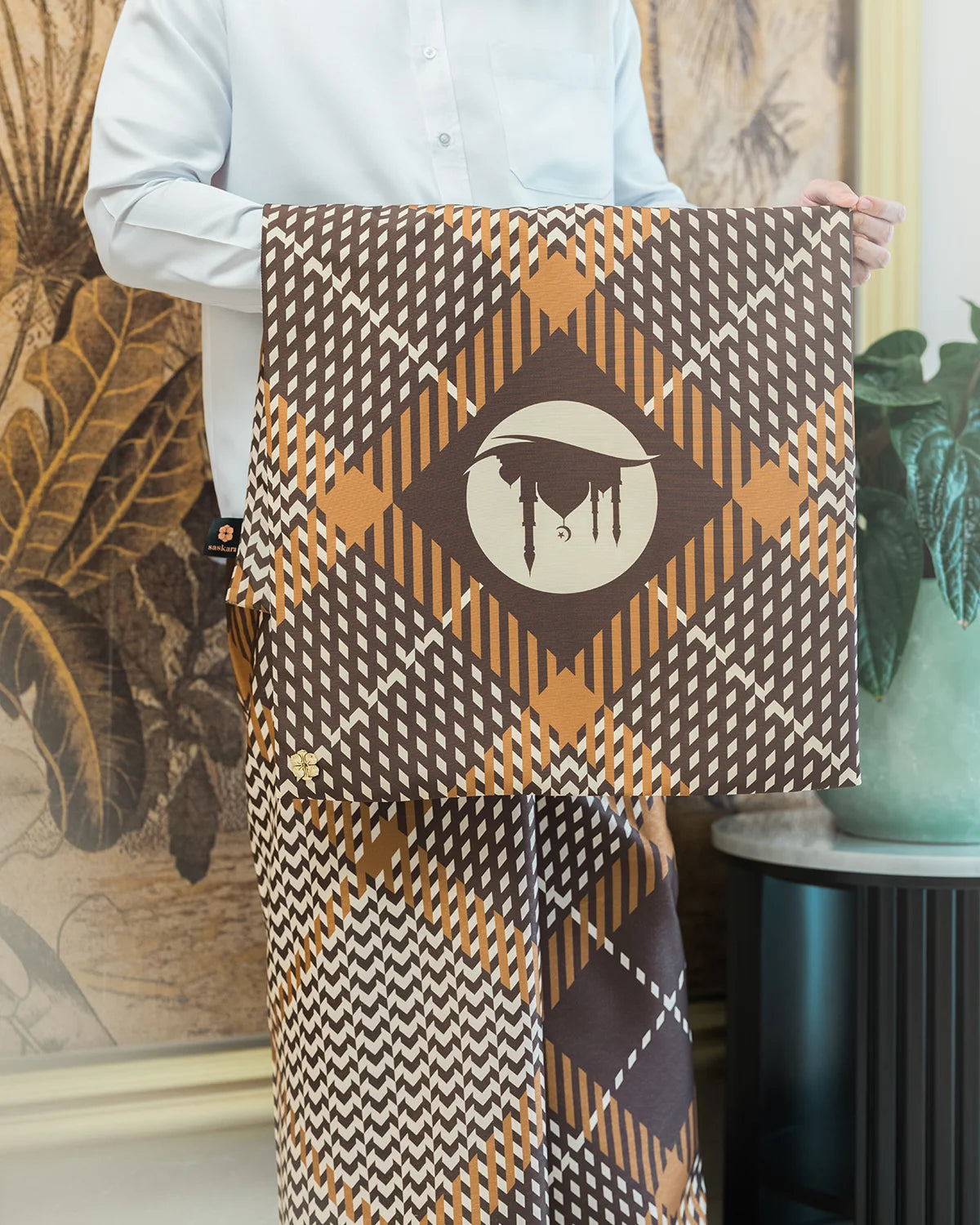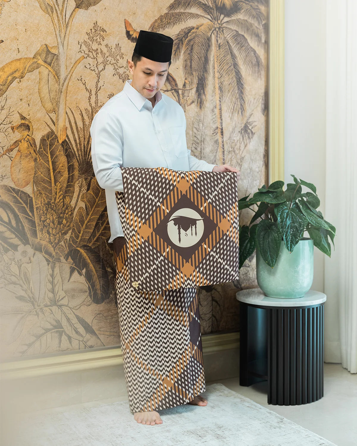 Travel prayer set for those whos active and productive. Designed carefully for him, this prayer set crafted from delicate and soft fabric, which can be folded easily in no time and hassle free. Comes with regular size prayer mat (in tone with the saroong pattern and color), it will give you a whole new prayer experience.