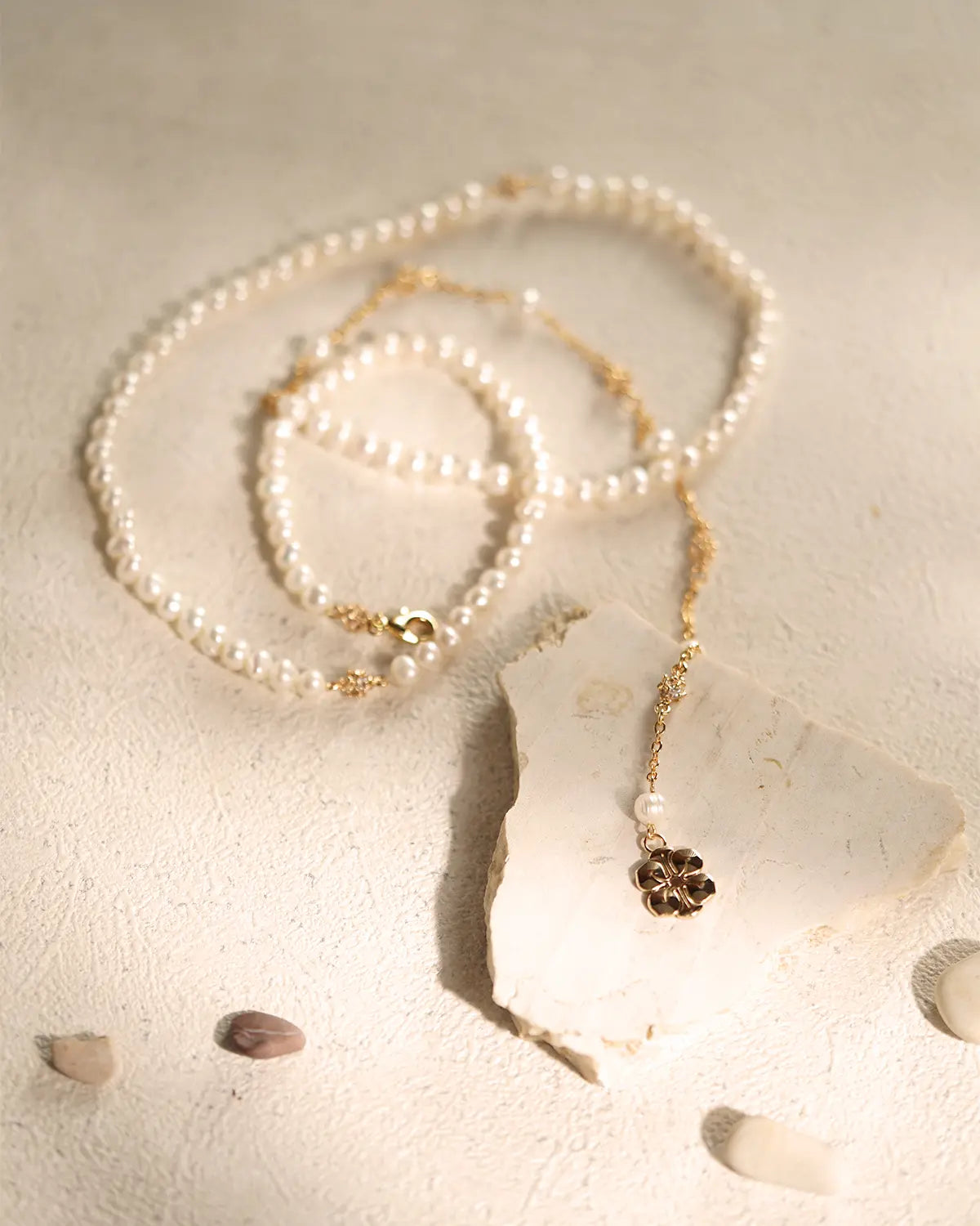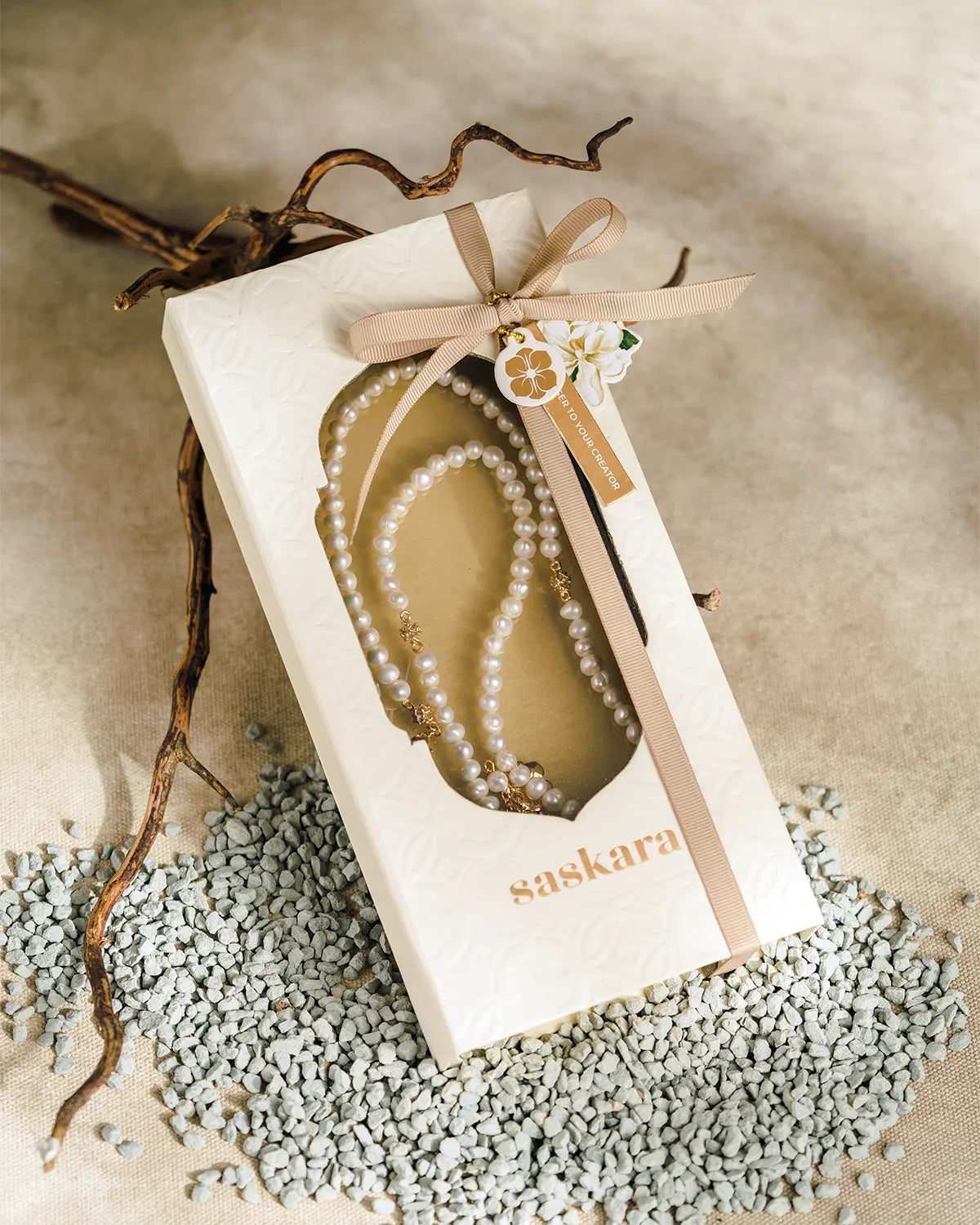 KAMALA the prayer beads (99) are made to accompany the worship of dhikr, to glorify the names of the Almighty. Consist of freshwater pearls, gold plated beads divider, attached in gold plated SASKARA logo. This beautiful design could also be used as necklace or bracelet in your everyday routines. KAMALA is a part of Kilau Mandalika series, representation of Indonesia’s heritage from Nusa Tenggara Barat Province. Stay connected with the Almighty with SASKARA.