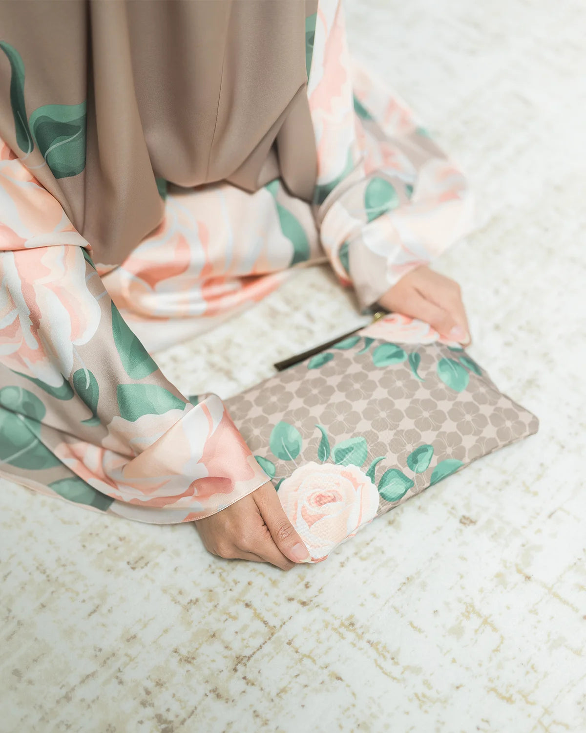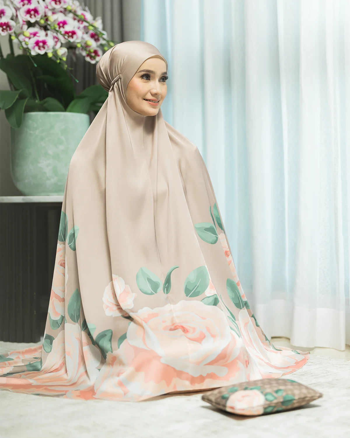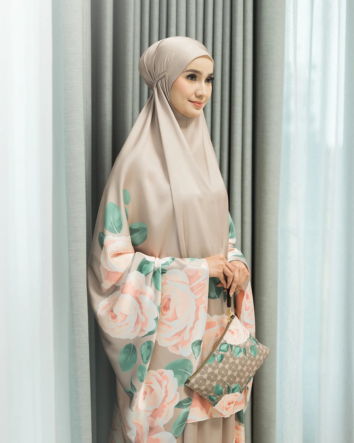 A classic prayer robe made from soft and light satin silk, to keep you comfortable, and it feels as smooth as silk. Decorated with a beautiful floral print and a lovely pouch will keep your daily essentials organized.
