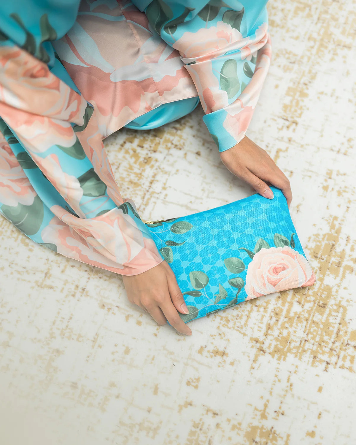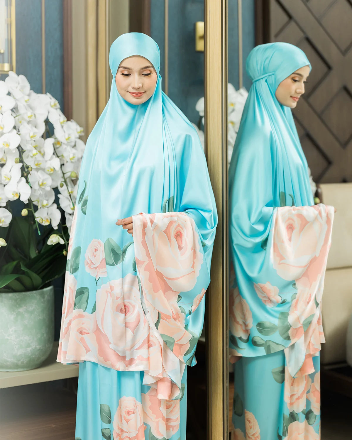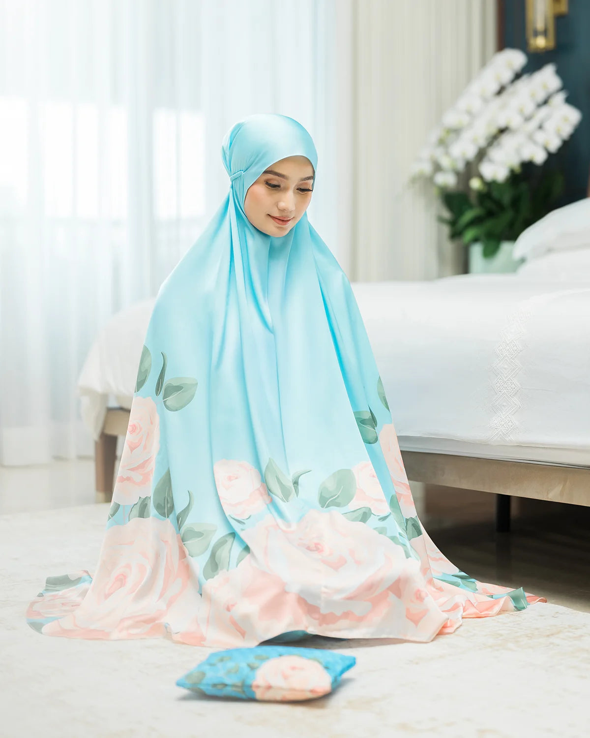 A classic prayer robe made from soft and light satin silk, to keep you comfortable, and it feels as smooth as silk. Decorated with a beautiful floral print and a lovely pouch will keep your daily essentials organized.
