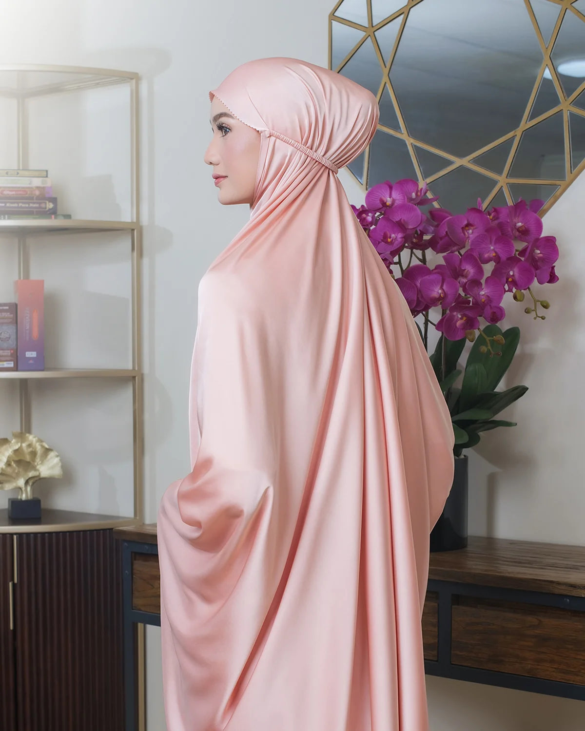 A Classic prayer robe made from soft and lux satin silk, to keep you comfortable and feels smooth as silk smoothness. Came with a sweet mini pouch and a small-size prayer mat crafted from gentle and lightweight satin, will keep your daily essentials organized.