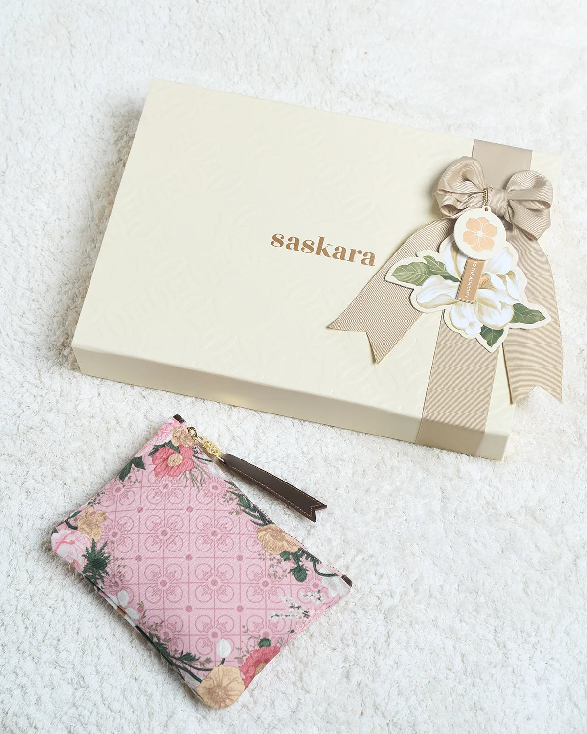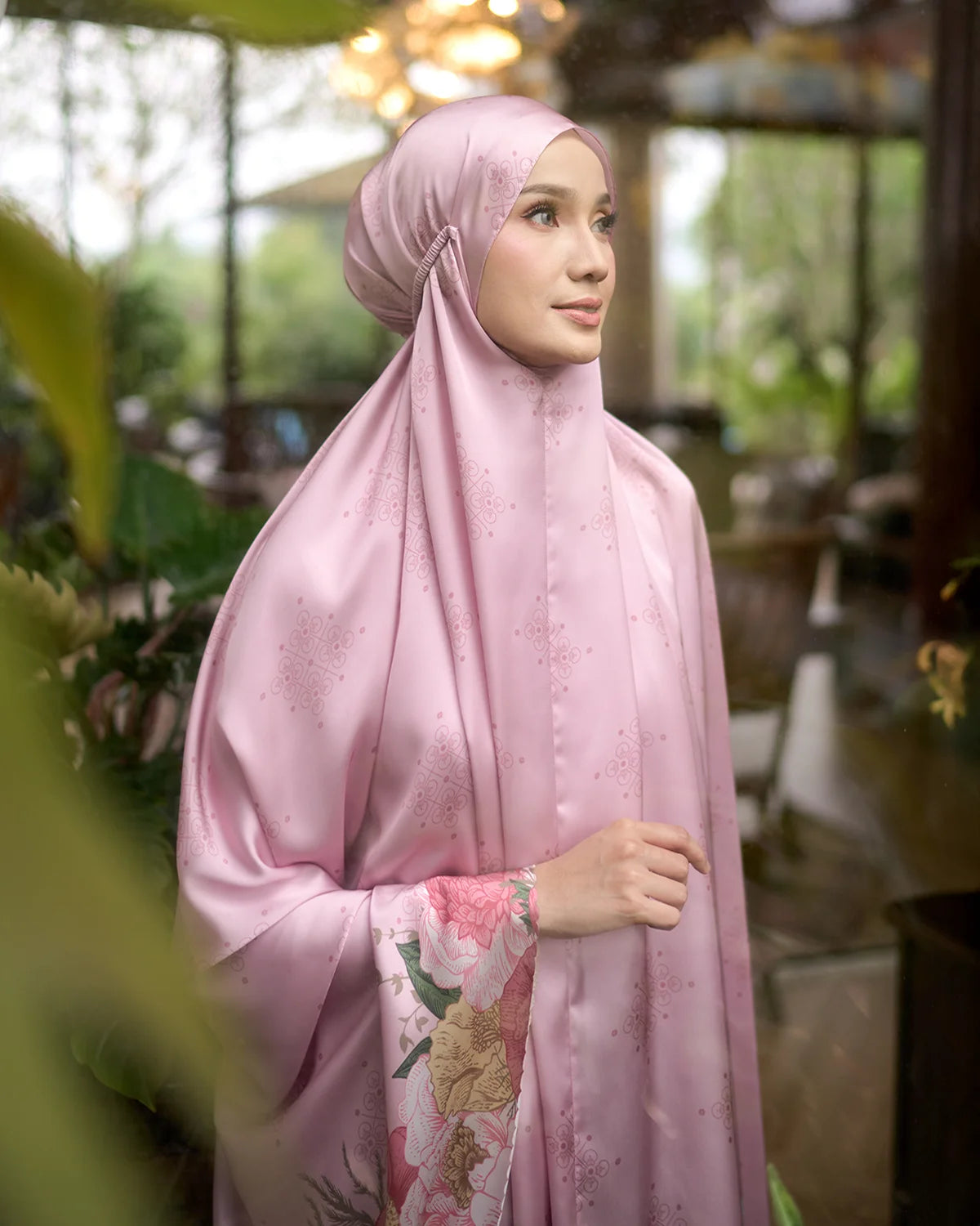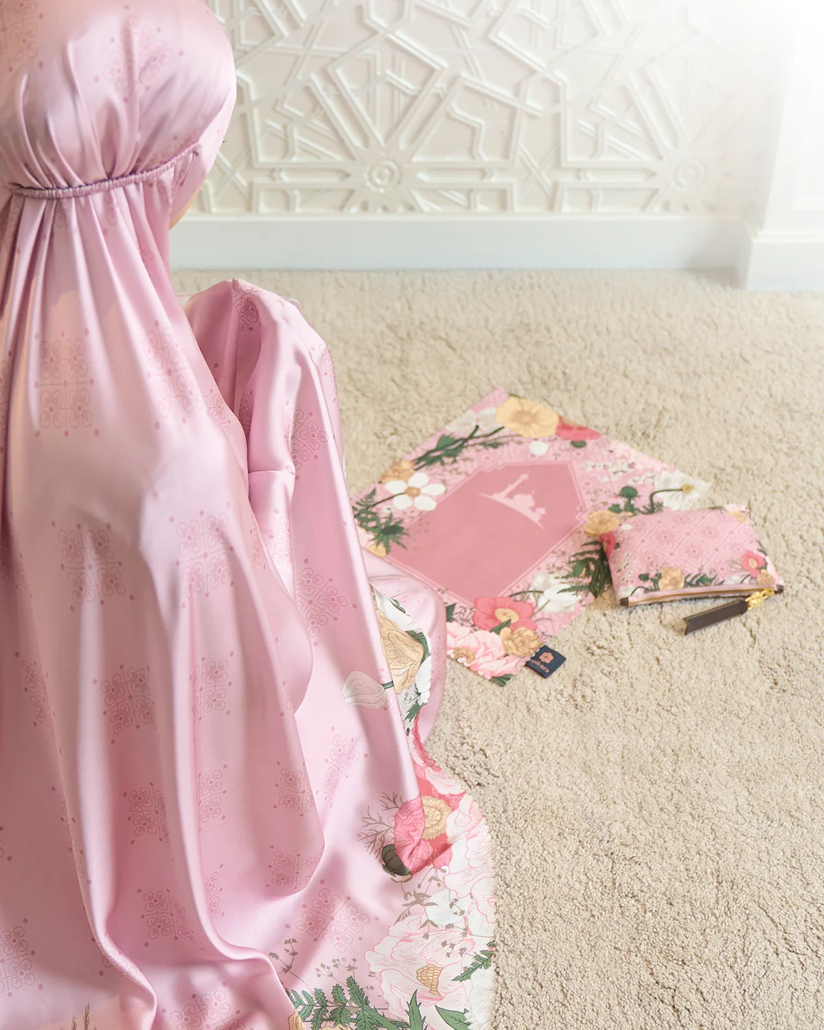 A pocket full of love. Crafted from delicate fabric for super smooth and silky touch. Indulge in little luxury with this print soft satin silk. Come with small pouch and mini size prayer mat that always fit in your bag.